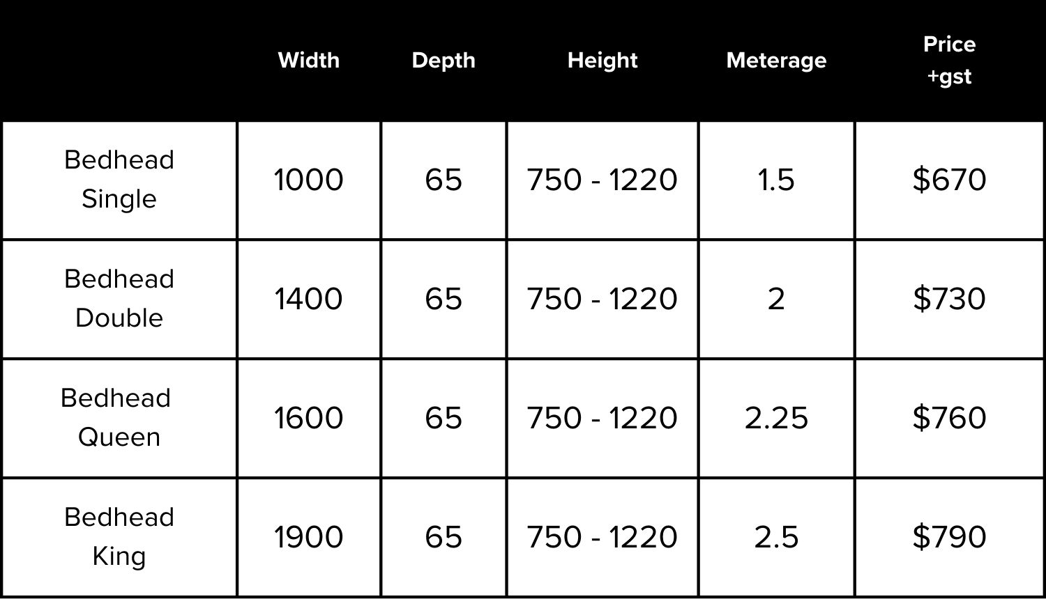 All are 65mm thick with wall attachment rails provided.